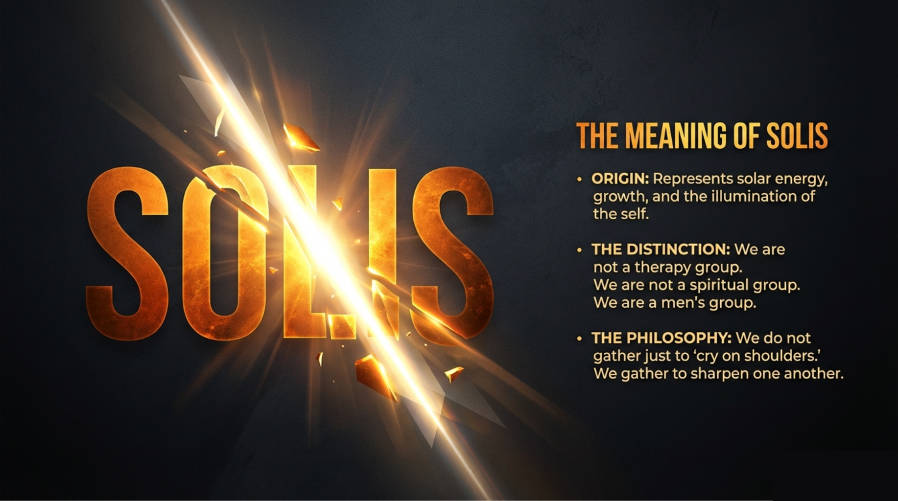 Solis Brotherhood is a modern online men’s circle, for those committed to living with integrity, purpose, and fire, grounded in breath, brotherhood, and the four pillars: Finances, Relationships, Purpose, Health.